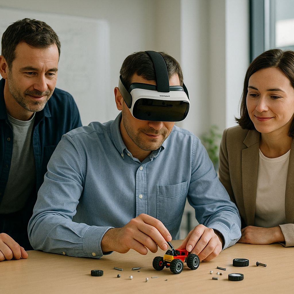 Interactive learning scenarios with VR headset: employees explore resilience strategies in a simulation-based serious game.